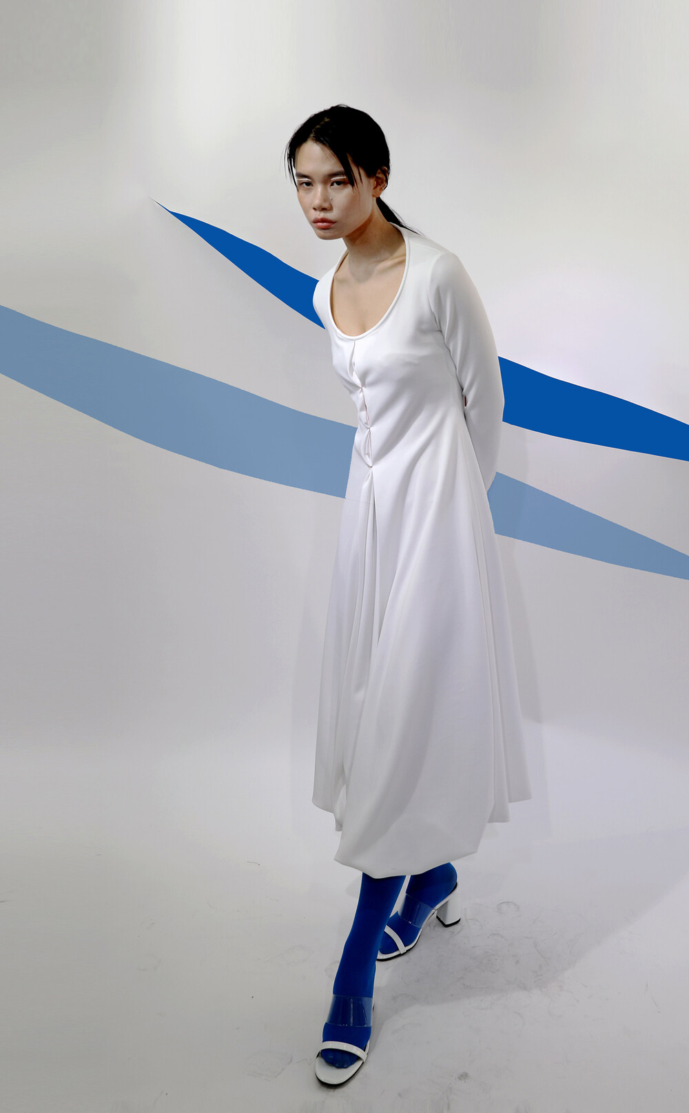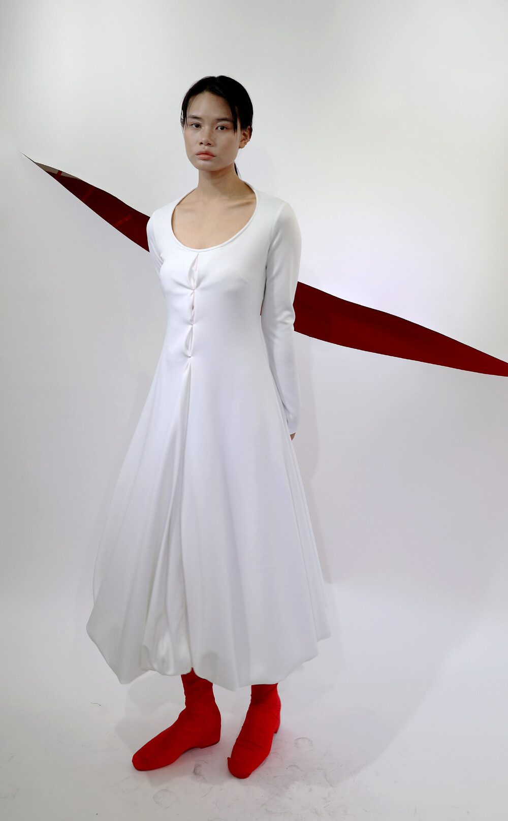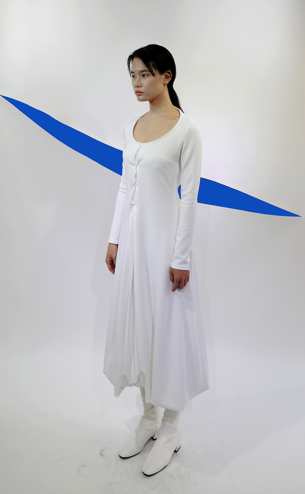 HOLE-NECKLINE TUCKING DRESS_WHITE