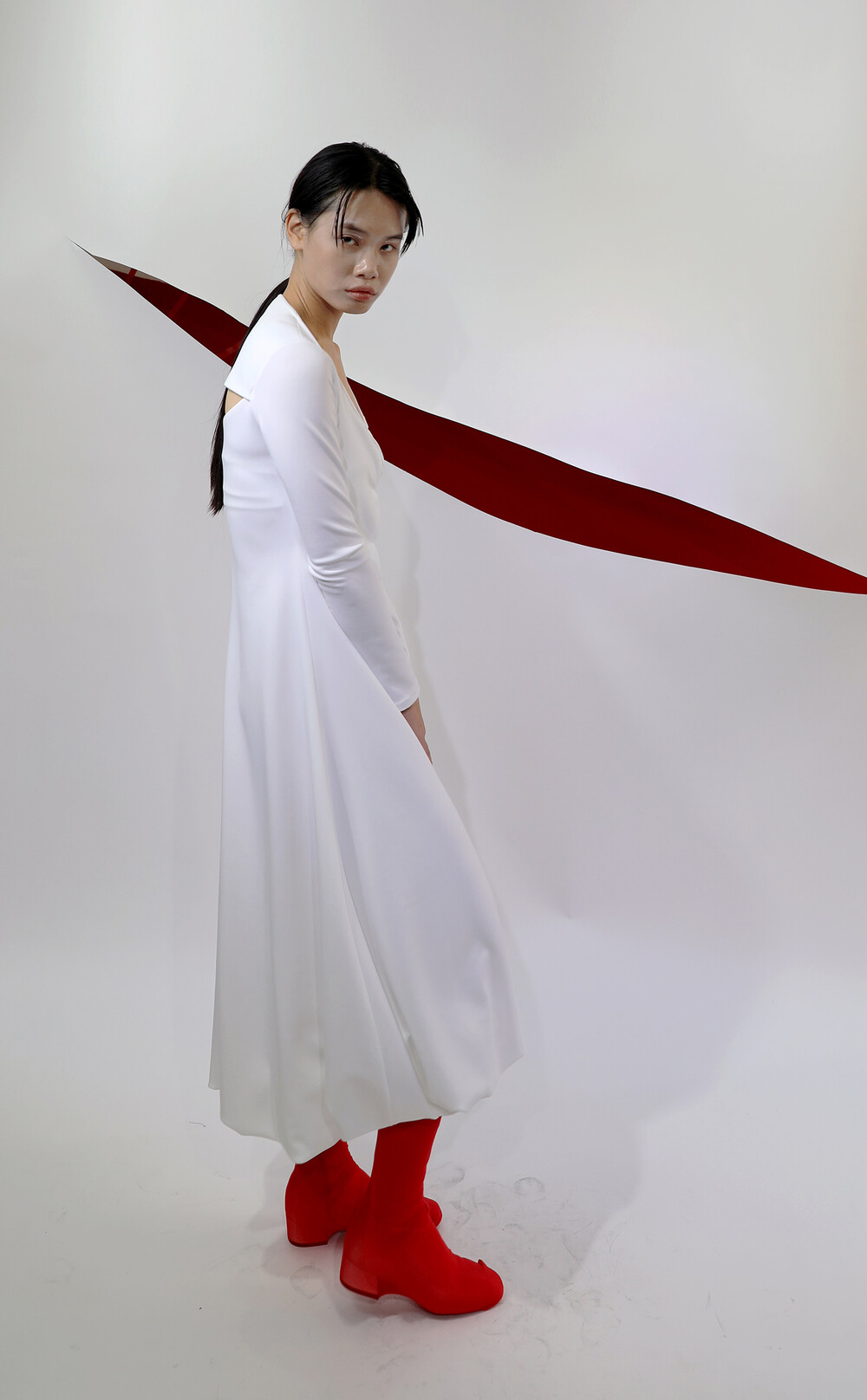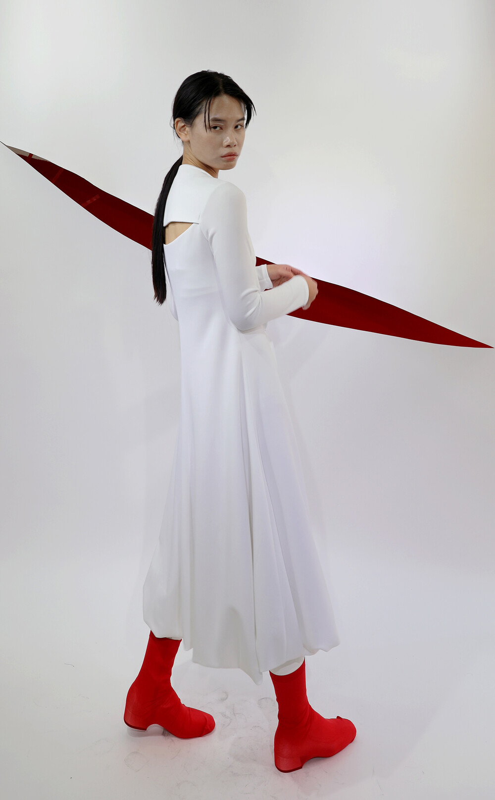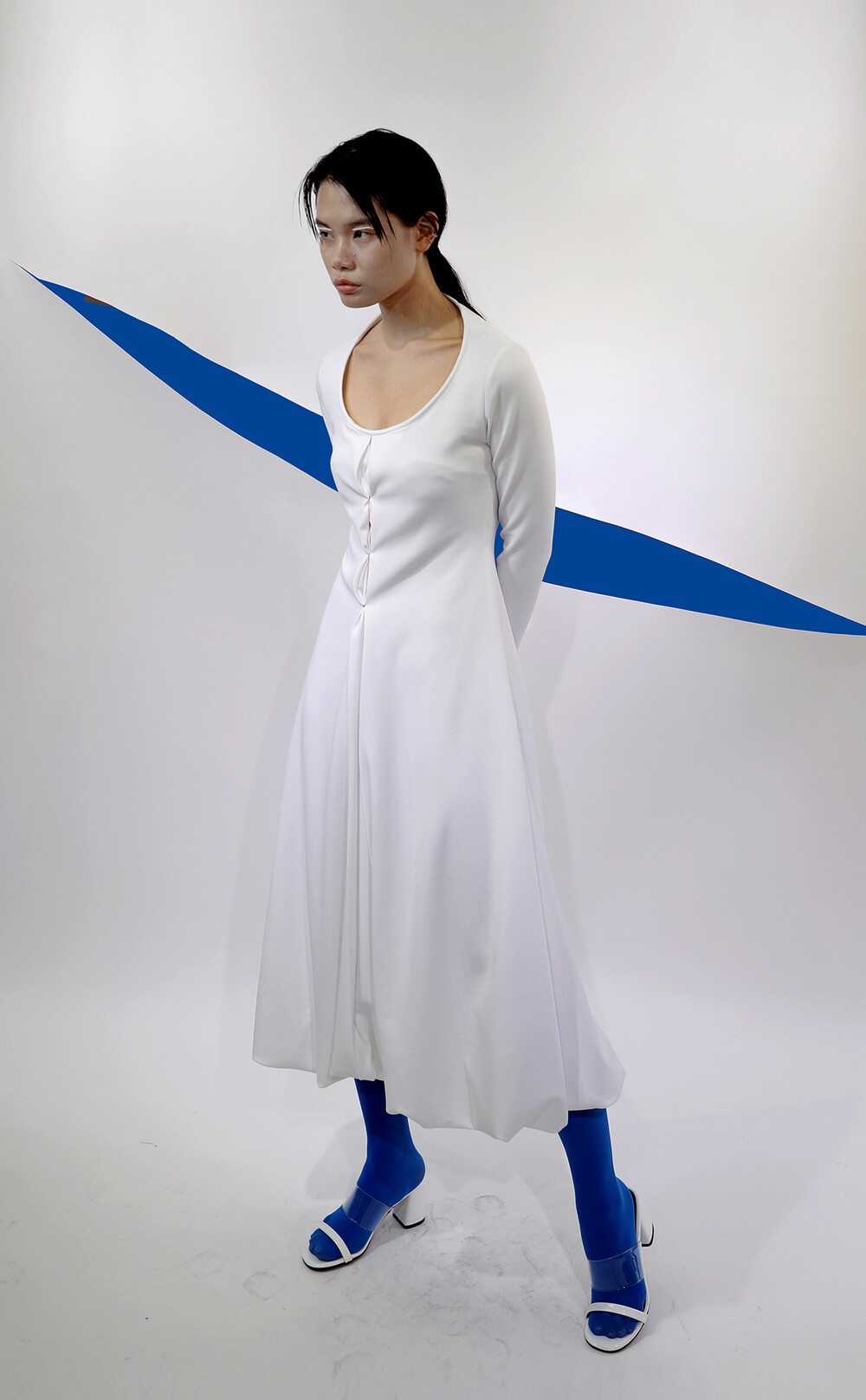 HOLE-NECKLINE TUCKING DRESS_WHITE